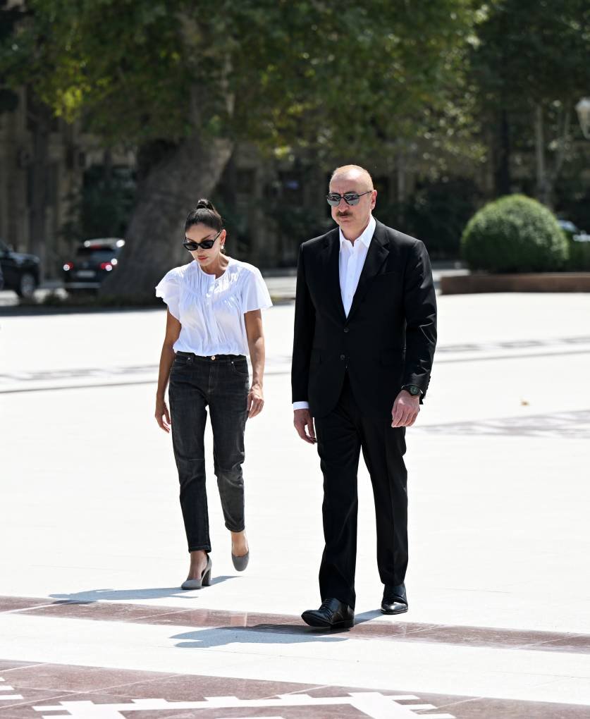 Dövlətimizin başçısı və birinci xanım Ulu Öndər Heydər Əliyevin şəhərin mərkəzində ucaldılan abidəsini ziyarət edərək, önünə gül dəstələri qoyublar.